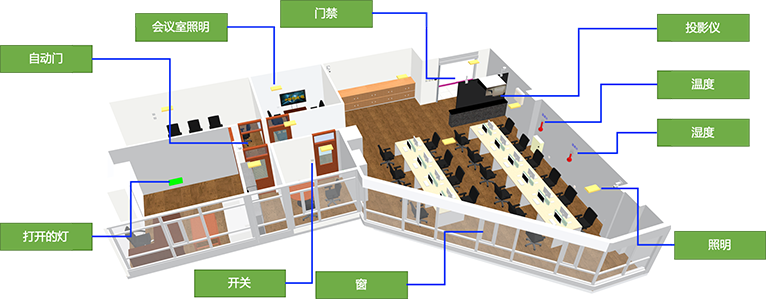 物联网智控系统功能模块:信息采集、控制中心、用户鉴权、智慧照明、环境监测、空调节能、大数据等。